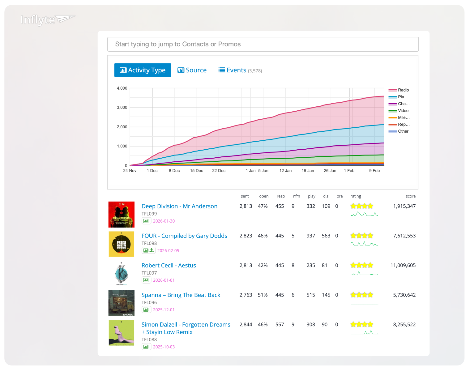 Inflyte is the only promo tool that works with a suite of integrations that includes Pioneer DJ rekordbox, Dropbox, Spotify, Apple Music, Amazon Alexa, Google Maps and Twitter.